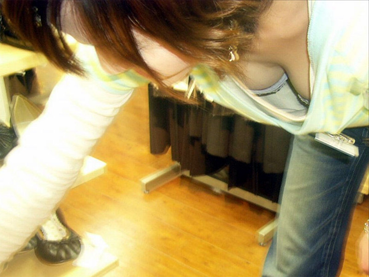 アパレル系の接客仕事、特に座りこんで接客をする靴屋店員は胸元がゆるゆる…胸元が空いた服装で、客に靴を履かせた瞬間に胸元から谷間が丸見えになった瞬間を狙われて、胸チラ盗撮されたエロ画像まとめ。