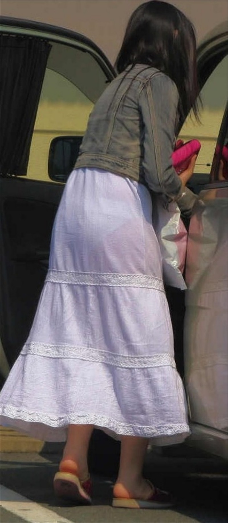 【パンティライン盗撮エロ画像】太ももがピチピチな白パンツ履いた素人の透けパンを街撮りした画像ww